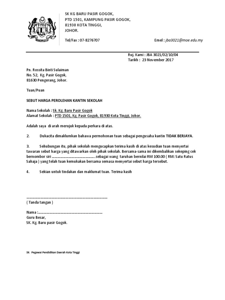 Surat Tidak Berjaya Tender Kantin Pdf