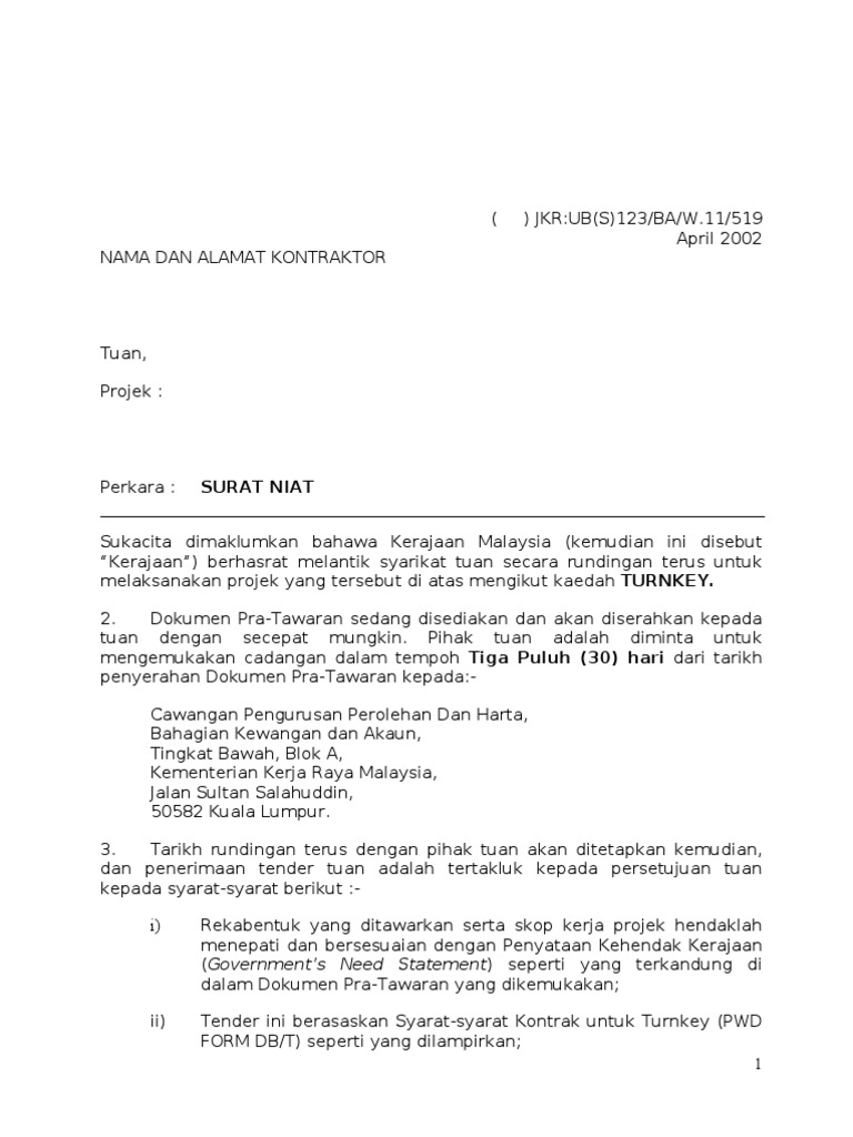 Pdf Surat Setuju Terima Tender Letter Of Acceptance Of Tender Nabilah Aiman Academia Edu